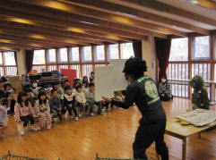 | 開催日 平成28年 1月21日(木) 静岡県磐田市中泉の「磐田市立磐田西幼稚園」にて開催。 ○第251回目となる環境教育(みんなで地球さんを助けよう!) は、磐田市中泉の「磐田市立磐田西幼稚園」のご依頼にて、 年長・年中・年少の園児125人と保護者をを対象に 開催しました。 ごみらが登場して、アイスの袋を捨てたら、怖〜い顔でしかられ ちゃった。始めのうちはちょっと声が小さめだったけど、最後には すっごく大きな声になりました。 見に来てくれたお母さん達も、みんなと一緒にぽい捨てはだめ〜 やってくれました。 |